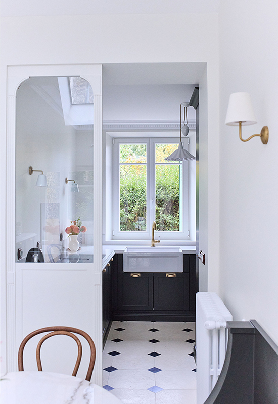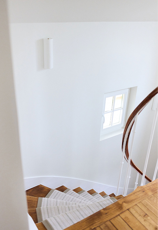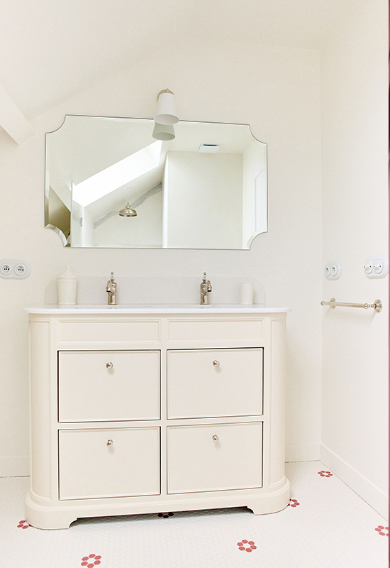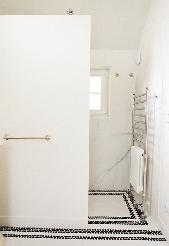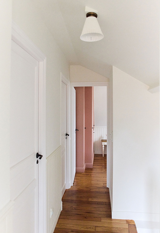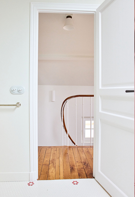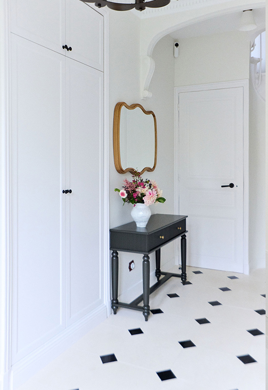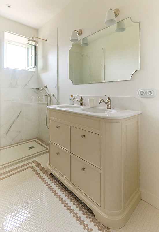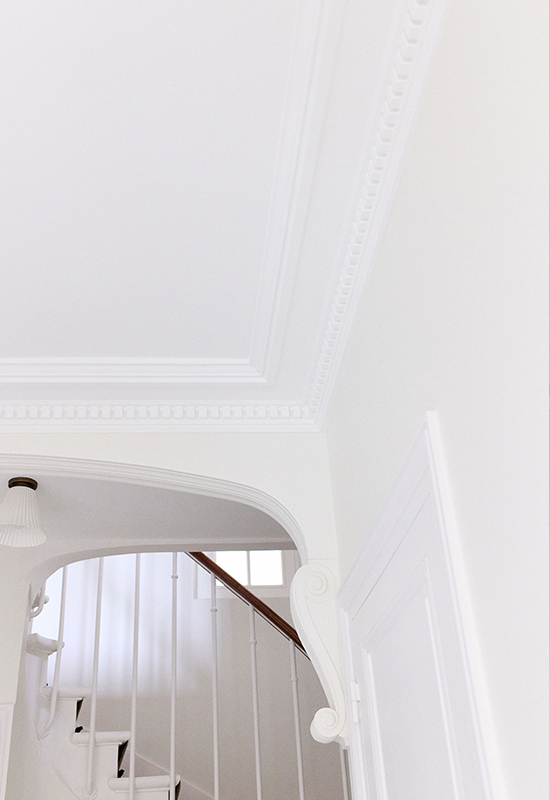 Deux ans de travaux (avec les démarches administratifs). Un travail entièrement dessiné et réalisé sur mesure: la menuiserie (cuisine, dressing, têtes de lit, meuble de salle de bain, banquette, moulure en staff, cheminée, bibliothèque, garde corps..). Tout le mobilier et la décoration ont été choisi avec soin pour l’harmonie du projet.